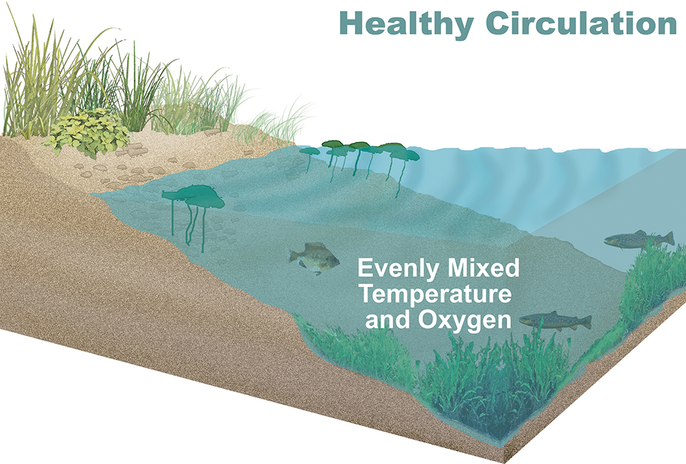 During cooler months, stratified ponds and lakes can experience problems when they suddenly destratify during wind and storm events. De-oxygenated bottom waters, laden with toxic gasses, can suddenly rise to the surface, resulting in massive fish kills and/or odor problems. Nutrients trapped in bottom waters may cause sudden algae blooms when released to the surface.