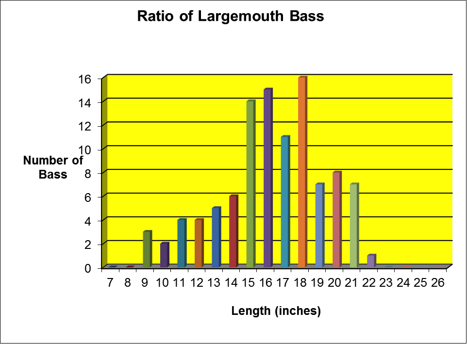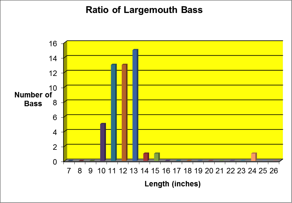 Population charts determine if the fishery has balanced size classes. You want to see one-pounders, two-pounders, three’s, four’s, five’s, and up. Unfortunately, poor harvest means bass stack-up in 10 to 13-inch ranges. Young fish, like teenagers, are growing fast and have big appetites. If not controlled, they deprive larger sportfish of ample food for continued growth. Without harvest, a lake may not produce bass larger than three-pounds. The poor profile below clearly illustrates where to focus harvest. Consistent harvest will produce success shown in the preferred profile.