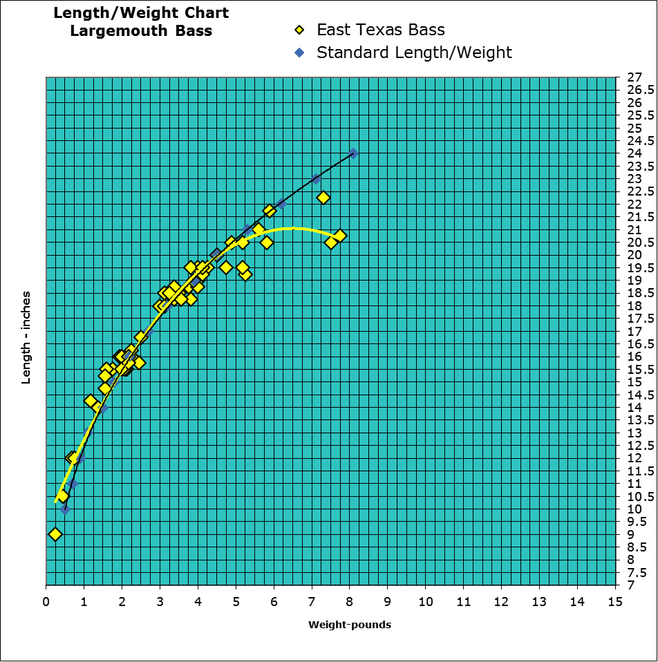 groundbreaking study on bass growth rates decades ago. He sampled thousands of bass to document age, length, weight, and diets. Dr. Anderson’s renowned work established what he called relative weight standards. The data determined what a bass of a given length should weigh if developing normally. His chart is still used by biologist throughout the industry. We reference it evaluating bass in your lakes.