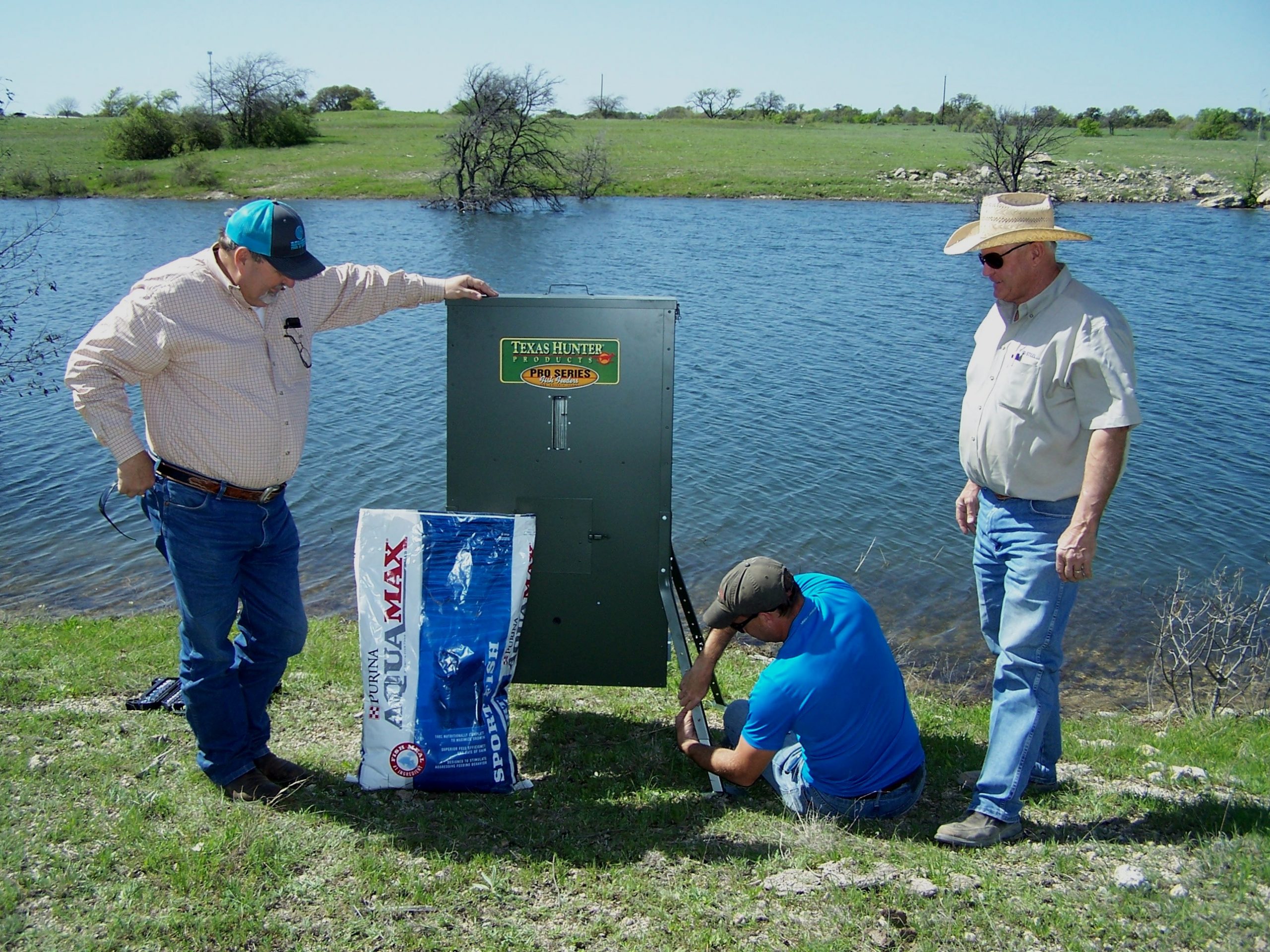 Thoughtfully select fish feeder locations. Place them near proper habitat, again so fish travel the minimum distance when pellets rain across the surface. Carefully evaluate your pond’s annual water level fluctuations. If it’s susceptible to sudden rises, place feeders on elevated bases or floating platforms to prevent flooding. If livestock or wild pigs frequent the pond, consider securing it in a wedge-shaped fence with cattle panels that extend slightly into the lake.