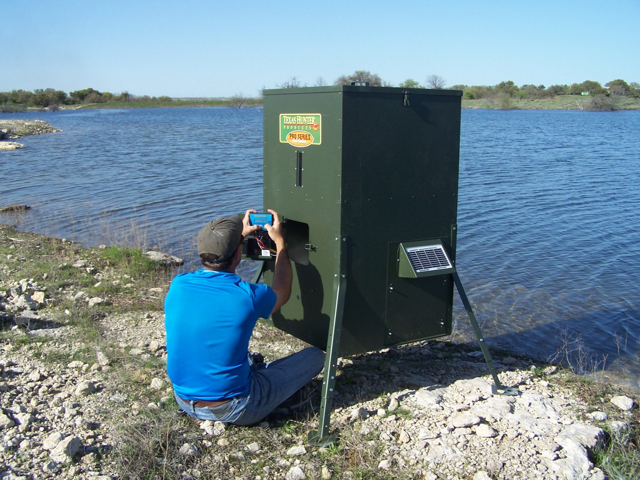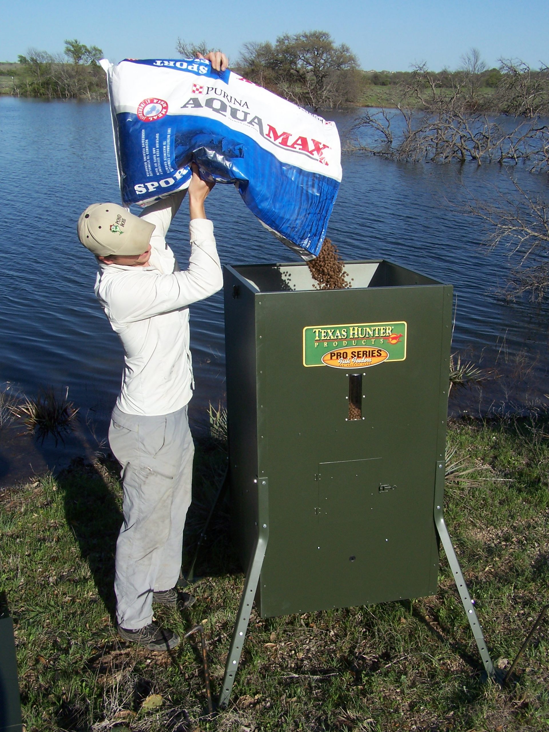 Since fish are cold-blooded critters, water temperatures influence feeding habits. As water temps drop below 70, a fish’s cold-blooded body transitions to winter. During summer months, they should consume a five-second-feeder spin in 10 minutes. By early November, that same amount may take 15 or 20 minutes. Their darting, swirling flashes soon appear in slow motion. Near Thanksgiving, you may notice leftover pellets on the surface when fish cease eating. That’s your sign to stop! They randomly nibble a few bites after successive, warm days, but it will be short-lived. Don’t refill feeders after Thanksgiving. If you have a bag or two of leftover feed, place it in a sealed container until spring. Delete programmed feeding times so feeders don’t continue running all winter and cause undue wear and tear on the spinner motor. Keep batteries connected to the solar charger. If you remove batteries, still keep them charged for extended life.
