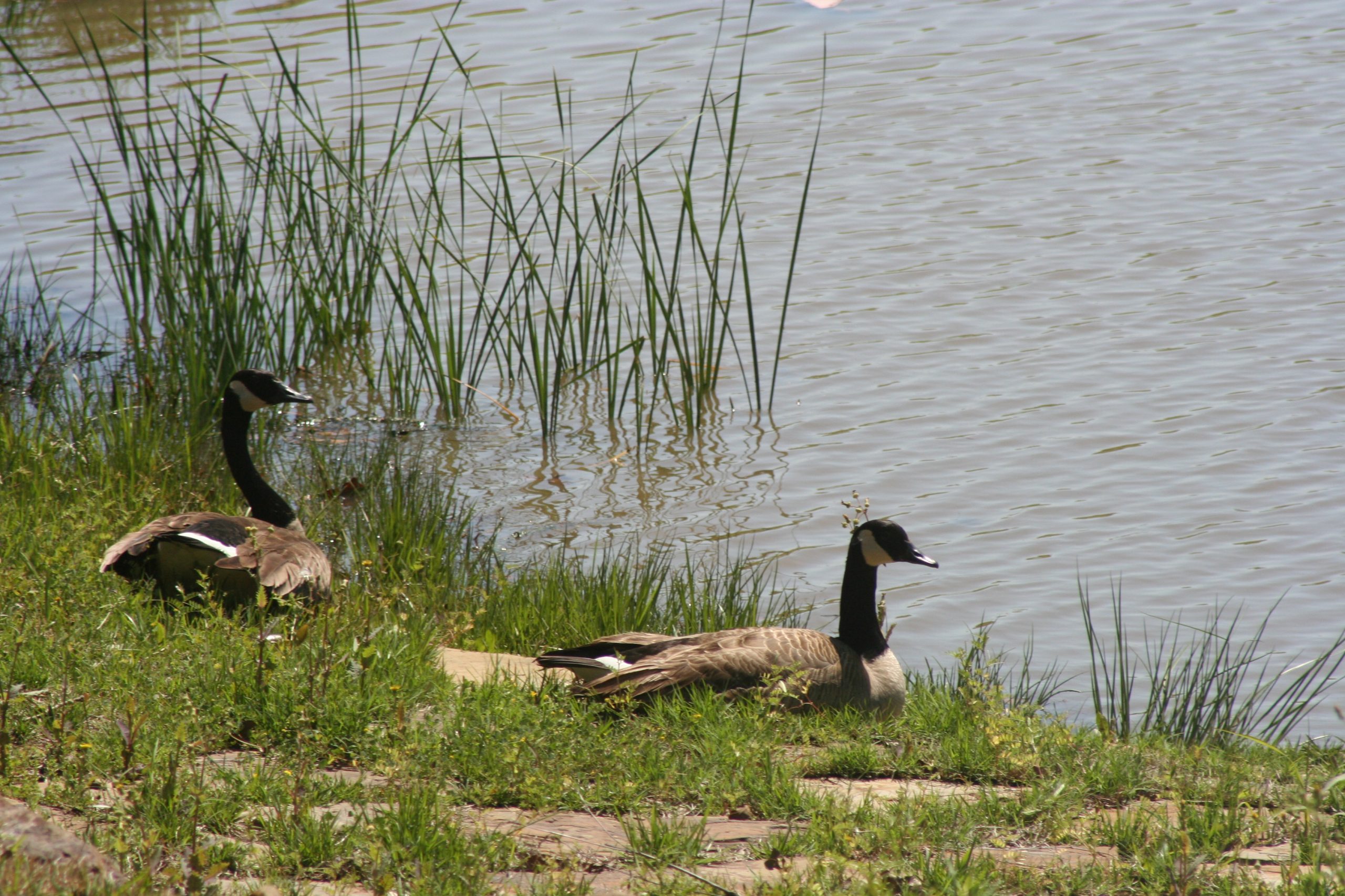 These geese are seeking a safe place to nest. Often, that’s near aquatic plants, such as the cattails in the background.